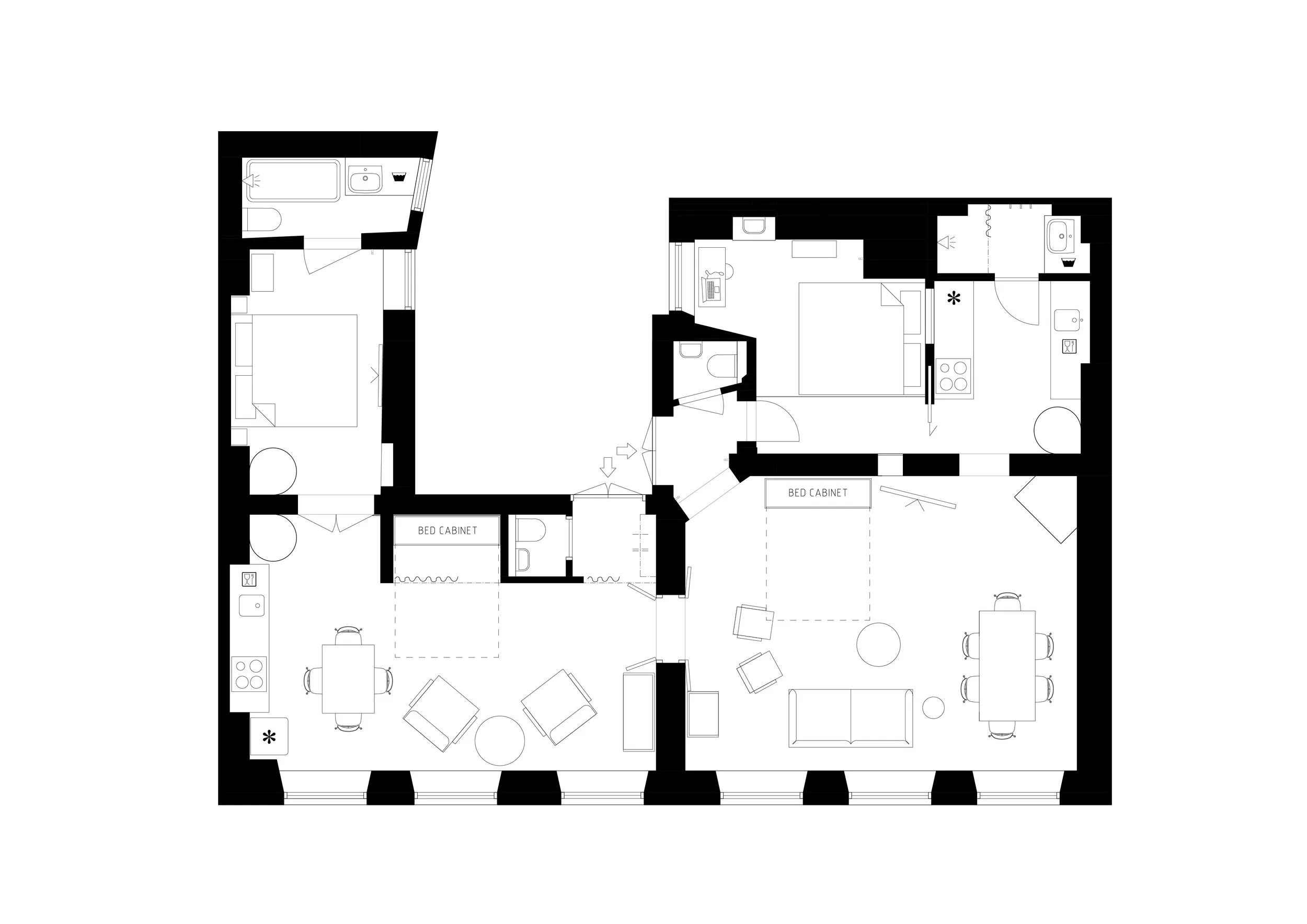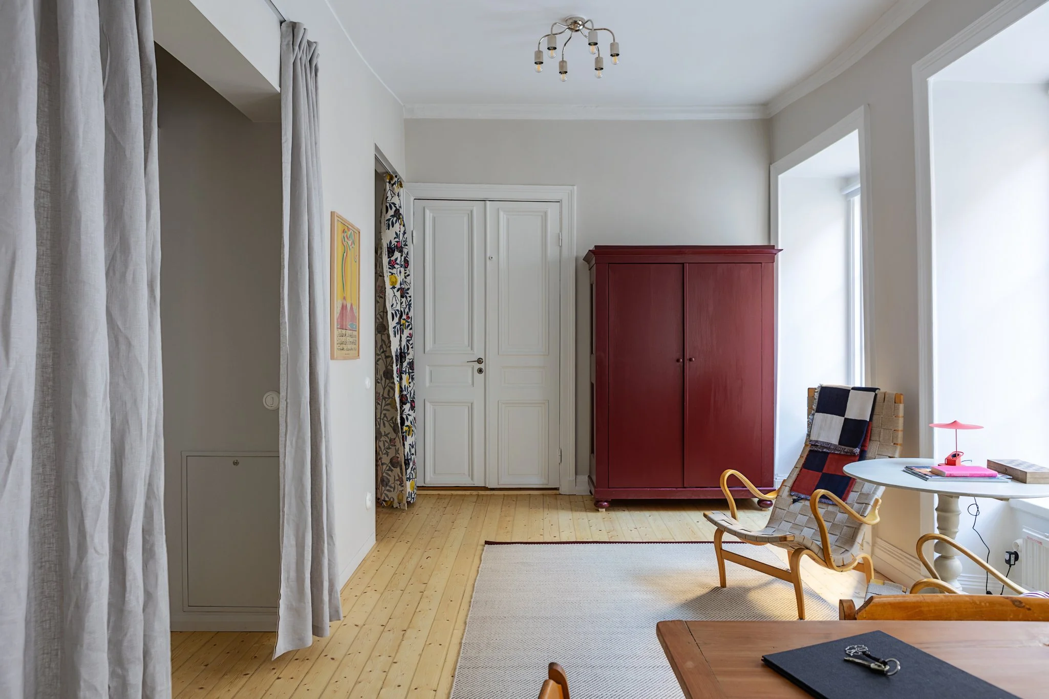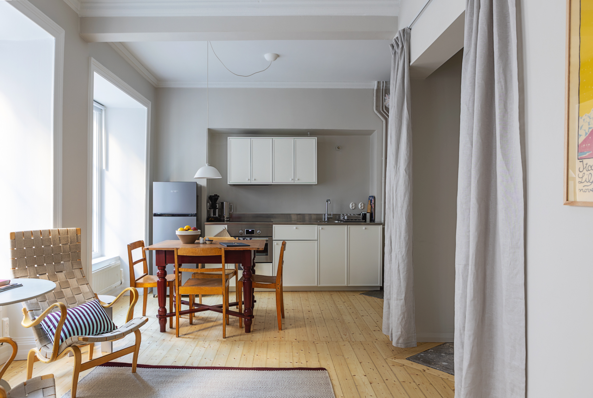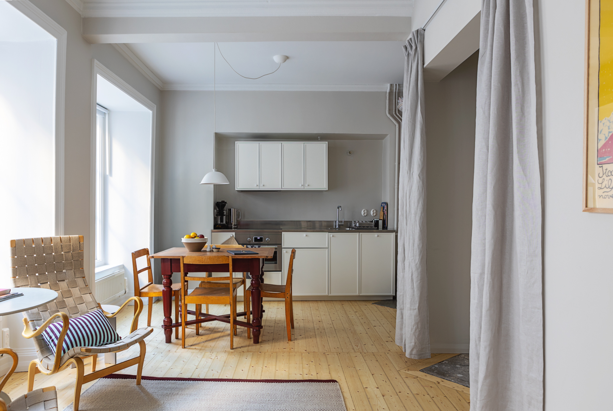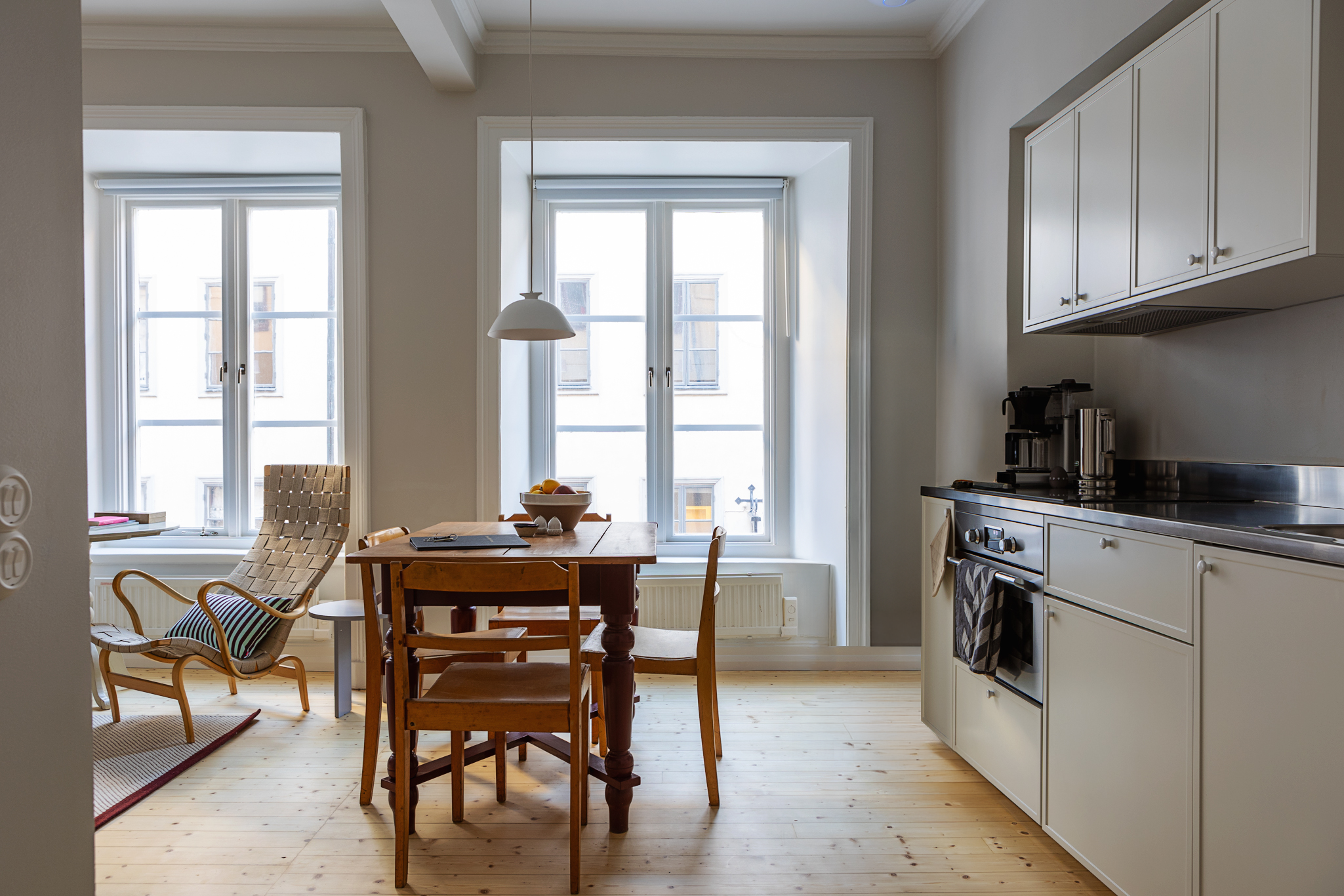 I en 400 år gammal byggnad har två flexibla uthyrningslägenheter varsamt renoverats och fått ny färgsättning. Uppdraget omfattade även inredningskoncept samt urval och inköp av lös inredning. Delar av befintlig inredning har rustats upp och kompletterats med nya möbler och auktionsfynd.